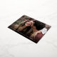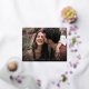 A modern save the date postcard designed to accommodate your favourite horizontal or landscape oriented full-bleed engagement photo. Your names appear near the bottom of your photo in gold foil handwritten script lettering, with your wedding date and wedding location beneath. Postcards reverse to show additional save the date details, including your wedding website, with your return address and space for recipient addressing.