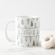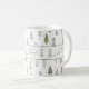 Stylish holiday mug featuring the greeting HAPPY HOLIDAYS in a modern handwritten script and a pattern of hand-drawn abstract Christmas trees and forest trees in winter snow in shades of sage green on a white background. ASSISTANCE: For help with design modification or personalization, transferring the design to another product or if you would like coordinating items, contact the designer BEFORE ORDERING via the Zazzle Chat MESSAGE tab or email makeitaboutyoustore@gmail.com.