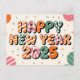 Usher in 2025 with a burst of colour! This vibrant and festive postcard features "Happy New Year 2025" written in bold, playful, multicolored letters adorned with stripes, polka dots, and solid colours. The light background, decorated with small dots and abstract shapes, enhances the celebratory feel. Perfect for sharing New Year wishes with friends and family, this postcard is ideal for anyone who loves lively and eye-catching designs. It's a wonderful way to spread joy and excitement for the New Year, making it a great gift for festive occasions.