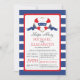Modern Heart Buoy Engagement Party Invitation featuring a red and blue heart buoy with a fun bold wide blue and white stripe background. Flip the invite over to find a matching stripe back. Perfect unique nautical invitation to announce your engagement to your friends and family.
