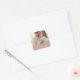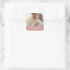 Soft and romantic wedding favour stickers featuring the word "Love" in delicate heart script calligraphy with a custom couple's photo on a warm toned muted pink background. The elegant square format is ideal for favour boxes, gift bags, or envelope stickers at your wedding or bridal shower celebration. All text and photo are fully customizable.