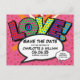 Featuring love hearts confetti, a fun, cool and trendy comic book inspired save the date card that puts the wham, zap, pow into your wedding date announcement. The reverse features matching love hearts confetti on a pink comic book polka dot background. Designed by Thisisnotme©