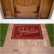 Modern Hello Burgundy Gold Script Family Name Doormat