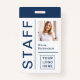 This modern, eye-catching company ID badge for your staff is much more on-trend and stylish than any old ID badge! The navy blue and white design features big, bold typography, with a minimalist arrangement of lines and room for your employee's photo, as well as a spot for your company or event logo. The back of the badge has room for additional information, if needed. This badge is professional enough for your corporate or professional conference or standard office, yet up to date enough for your entertainment or musical event or concert staff and security.