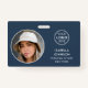 Impress with a stylish and professional identification badge. This double-sided template features your ID photo in a circle, and is personalized with a name, logo, contact information, and a scannable QR code. Customize the text to match your brand. This modern design would suit many different workplaces and professions, including corporate professionals, retail salespersons, beauty consultants, hotel staff, small businesses, conference name tags and more! Printed colours: slate blue, black and white.