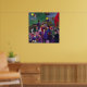 Impressionist vision of a crowded bar.  Various sizes available.  A group people in a bar is captured in this image. The walls of the bar are painted red with green accents, and a bright yellow circle with a dark brown centre is in the foreground. On the far left wall of the bar hangs a painting of a man and a woman, while on the far right is a painting of a woman in purple. The people in the bar are talking and laughing, creating a warm and inviting atmosphere.