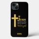 Stylish black JESUS RANSOMED ME Christian Monogram iPhone 13 case, proclaiming the Christian message of Christ's victory at the Cross. The design shows a large yellow gold cross, and text that reads JESUS RANSOMED ME FROM SIN & GRAVE HALLELUJAH! There is a gold coloured crown above the J of Jesus. The text appears in white and yellow typography. All text - EXCEPT 'JESUS' - is CUSTOMIZABLE, so you have the option of just having JESUS, or you can change 'ransomed' to 'rescued' or 'saved'; or you can change 'sin & grave' to an addiction, or 'Hallelujah' to 'Praise Him'. The choice is yours! Choose from a wide selection of Christian faith-based phone cases designed by #bereandesigns.
