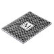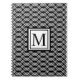 This modern, trendy notebook features a white geometric lattice all-over design with a black background. In the centre is a framed monogram letter in black.