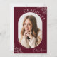 A modern graduation party photo invitation template, featuring a minimalist burgundy and white leaf line art design. This simple grad party invite is perfect for your celebration. Personalize by yourself using the online template tools. THE SAMPLE PHOTOS ARE NOT INCLUDED. REPLACE WITH YOUR OWN PHOTOS BEFORE ORDERING.