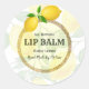 Lemon themed Lip Balm product label featuring two lemons with foliage, a background of watercolor lemons and leaves done vellum style, and a gold glitter trim around the text. Fresh lemony theme for your handmade self care products for selling at farmer's markets, spas, or your home store. 20 stickers per sheet.