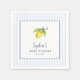 Cute fun and cheerful hand painted watercolor lemons baby shower napkins with blue and white stripes in the background.