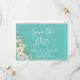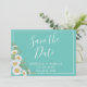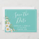 Pretty wedding save the date features watercolor white daisies corner on light teal background with white customizable text blocks in modern fonts