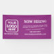 Modern, simple and eye-catching "Now Hiring" business banner; design combines a customizable magenta background with the always professional simple and easy to read white typography. Versatile design adapts to any industry or type of business. Simple update the text areas to your specific marketing and advertising needs.