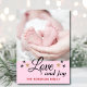 This modern "Love and Joy" photo holiday card is perfect for baby's first Christmas. Features “Love and Joy” in a modern script on a pink background, along with your favourite photo of your newborn baby girl. Personalize with your name. Back of card features white snowflake pattern.