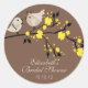 Cute love birds Bridal Shower round sticker featuring bride & groom birds sitting on a branch with yellow flowers set on a chocolate brown background. Great for bridal shower favour tags & envelope seals! Customize with your bridal shower information and you're all set to go! Matching invitations and postage stamps available in our shop www.celebrateitinvites.com.