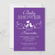 Start off your modern elegant baby shower off right with our trendy white love birds baby shower invitation featuring a stylish pair of chic love birds with a heart sitting on a flourish scroll branch set on a purple background for a baby girl baby shower. Just customize our invitation with your baby shower information and you're all set to go. Available in our shop in a large selection of popular & trendy colours.
