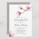A stunning wedding invitation featuring pink and cream watercolor magnolia branches on a white background and dark grey modern script font. The backing is in solid grey which can be removed.