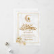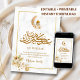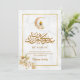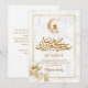 A chic and trendy design featuring a white marble background, a golden crescent moon with a mosque silhouette, and aesthetic dried floral arrangements. Perfect for a luxury holiday greeting.