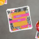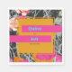 Bright orange square shape over pink orange and peach modern floral with dark marbleized design. Names are neon blue on hot pink bars.
