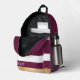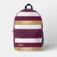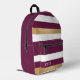 Stylish colour block striped backpack done in maroon, white and gold tone. Personalize the white name to suit your needs. Great for school, work, travel and more.
