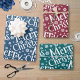 Modern giftwrap sheet set of 3 featuring whimsical or rustic typography of a MERRY CHRISTMAS greeting and snowflake patterns on a trio of jewel tone colours of red, green and blue.