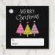 A pretty and modern Merry Christmas gift tag with pink, purple, and green Christmas trees on a black background. You can change the "to" and "from" text.