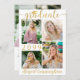 Modern, simple graduation announcement featuring faux metallic gold calligraphy script typography and graduation cap and personalized with 4 photos on the front (1 on the back) against an editable white background colour or select a styled graphics background. The class year is editable as well. The back side features a full-bleed photo and your custom text for details about your graduate. ASSISTANCE: For help with design modification/personalization, transferring the design to another product or if you would like coordinating items, contact the designer BEFORE ORDERING via Zazzle Chat or makeitaboutyoustore@gmail.com.