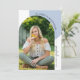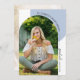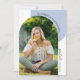 This modern graduation invitation features a trendy arched photo. The design is accented with a dusty blue colour and handwriting style text. The backside offers a full photo with the invitation text overlay.