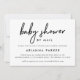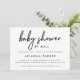 This elegant, minimalist baby shower by mail invitation features trendy black typography and a light blue back. A sweet way to celebrate a virtual shower or long distance shower when you can't be near the mother-to-be.
