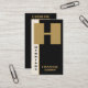 A modern and professional business card using black, gold, and ivory for a man or woman. Your initial on the front is to be personalized with your full name or business name. On the back is a QR code to add a "call to action." Also your name, title, address, phone, email, website, and social media information. Minimalist and professional to represent your brand or business. Fully editable-change the background and text colour to reflect your branding.