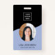 Modern minimal employee staff badge with a photo, QR code, company logo and employee's name and job title. You can easily customize it with your business details.