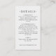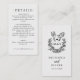 This business card=sized wedding details card offers a refined and elegant way to inform guests while maintaining a cohesive and romantic aesthetic. The front features a timeless black and white design with a delicate dove and floral crest above the couple's names and wedding date in a blend of script and serif fonts. The back presents clearly organized information about the reception, accommodations, RSVP instructions, or any other details using minimalist typography that complements the sophisticated style. Perfect for slipping into your wedding invitation suite, this card is ideal for formal, rustic, or classic weddings seeking stylish simplicity and seamless coordination.