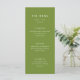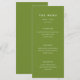 Modern Minimal Olive Green Custom Wedding Menu. A minimalistic and modern, dark olive green wedding menu card, designed with simplistic typography. Customize with bride and groom names, your wedding date, and your starters, entrées, and desserts.