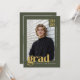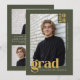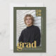 Honor your graduate with this modern olive green and gold graduation announcement designed for a refined, earthy aesthetic. The muted olive background pairs effortlessly with warm golden typography, creating a balanced and sophisticated color palette that feels both grounded and elevated. Featuring a clean editorial layout that highlights one standout senior portrait, this minimalist photo grad card makes a bold statement with its structured typography and timeless serif “grad” design. Ideal for high school or college graduates who want a distinctive yet understated alternative to traditional graduation colors, this fully customizable announcement allows you to personalize the name, class year, school, and details for a polished and memorable presentation. On the back, add an additional 3 photos and a custom message. © Kimbellished, LLC