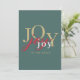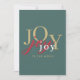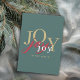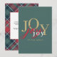 With elegant minimalist styling and modern mixed colour typography, this festive holiday card shares the joy of the Christmas season. It features the word joy multiplied 3 times in different colours; gold, red and white on a refreshing spruce green background. The back of the card has a template to personalize with your holiday message and name(s) and a rustic tartan plaid background in coordinating colours.