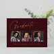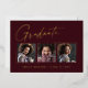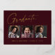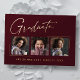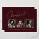 Clean, trendy, modern and elegant "3 Photo" graduation announcement gold foil cards (your choice of gold silver or rose foil), featuring design elements of modern text with a unique calligraphy ink script. The graduate's photos are accented with a delicate & minimalist partial boarder. The back of the card offers personalized text spaces for information about your graduation or can be cleared if you wish to hand write a message. Burgundy red with gold foil or easily customize the background to match your school's primary colour or any colour of your choice. Perfect for the high school, college and university grad student senior.