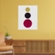 A modern, minimalist abstract art poster of three circles on a white background. The larger circle at the bottom is in a deep red with an overlaid faded effect, the circle above is slightly smaller in a deep, darl purple and the very last circle is smaller still in yellow. A lovely addition to any home.