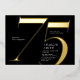 Modern minimalist 75th birthday party invitation features stylish gold foil number 75 and your party details in classic serif font on black background colour, simple and elegant, great surprise adult milestone birthday invitation for men and women.