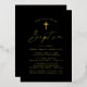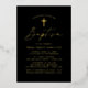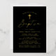 The simple baptism invitations feature a casual gold foil calligraphy script with a black background for a design that is perfect for modern baby baptisms. Personalize the elegant baptism invitations with your child's name and religious event details below. The back of the black and gold foil baptism invitation provides space for additional text and photos.