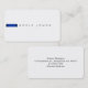 Modern Minimalist Business Card. Easy to make. Featuring a dark blue custom made bar and your choice of text style and content. Modern Minimalist Business Cards are ideal for a Designer, Interior Decorator, Architect, Civil Engineer, Cost Estimator, Salesperson, Project Manager, Hairdresser, Barber, Public Relations Consultant, School Counsellor Occupational Therapist, Dentist, Pharmacist, Psychologists, Psychiatrist, Accountant, Tax professional, Financial Adviser / Advisor, Realtor or Real Estate Agent, Attorney, Lawyer, Solicitor, Paralegal, Clothes Shop Owner, Legal Professional, Software / Web Developer, Programmer, Chiropractor, Computer Analyst, Database Administrator, Cleaner, Veterinarian, Interpreter & Translator, Event Planner, Sales Representative / Rep, Plumber, Carpenter, Electrician, Plasterer, Painter, Mason, Coach, Handyman, Glazier, Taxi Firm, Housekeeper, Delivery Driver, Courier, Auto Mechanic, Chef, Caterer / Catering, Social Worker, Cosmetologist, Tradesman and many other professionals.