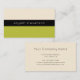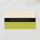 A modern business card design with a clean minimalist design, this card has a bright pistachio green, black and beige colour block pattern on the front and a simple matching beige background on the back of the card. The type face used is contemporary and elegant in its simplicity. The simplicity of this design makes it a good choice for a variety of business professions. Personalize the text template with your info.