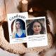 A Modern Script Graduate. Simple Photo Graduation Announcement Card with an arch photo on the front and the recipient's name and graduation details. The back contains a second shot with more details. To customize this design, click the edit button.