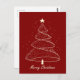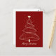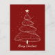 A modern minimalist design of a Christmas Tree with snow on a dark red background, with a Merry Christmas greeting.