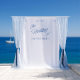 An elegant wedding backdrop banner featuring a beautiful handwritten script and clean serif typography in classic blue. Perfect as a photo booth backdrop or ceremony background. All text is fully customizable — edit the names, date and location to match your wedding. Part of the coordinated wedding collection "Florence" — explore matching pieces across the full suite. Mockups for this design were created using Midjourney AI.