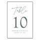 Elegant wedding table number card displaying the word "Table" in a dark sage green handwritten script with the table number, your names, and wedding date shown below with a white background. The design repeats on the back. To order the table number cards, simply type each number and add it to your cart.