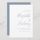 This simple modern wedding save the date card features dusty blue text in stylish handwriting calligraphy and sans serif font, aligned with the right margin on a solid white background. The back of the card is solid dusty blue.