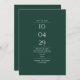 A modern minimalist save-the-date card featuring your special date and wedding details set in classic, chic typography on an emerald green background. Designed by Thisisnotme©