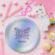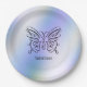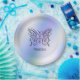 Elegant line drawing of butterfly on blue holographic background. Your name is below.