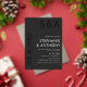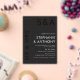 At the right side of the invitation, the wedding details are presented in white, showcased prominently against the dark grey background. The use of a clean and modern Futura font for the invitation text adds to the overall contemporary feel, while ensuring the information is clear and easily legible.