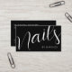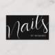 features title "Nails" in white modern script font style on front side with business details in white modern sans serif font style on back side, with QR code, on black background.
